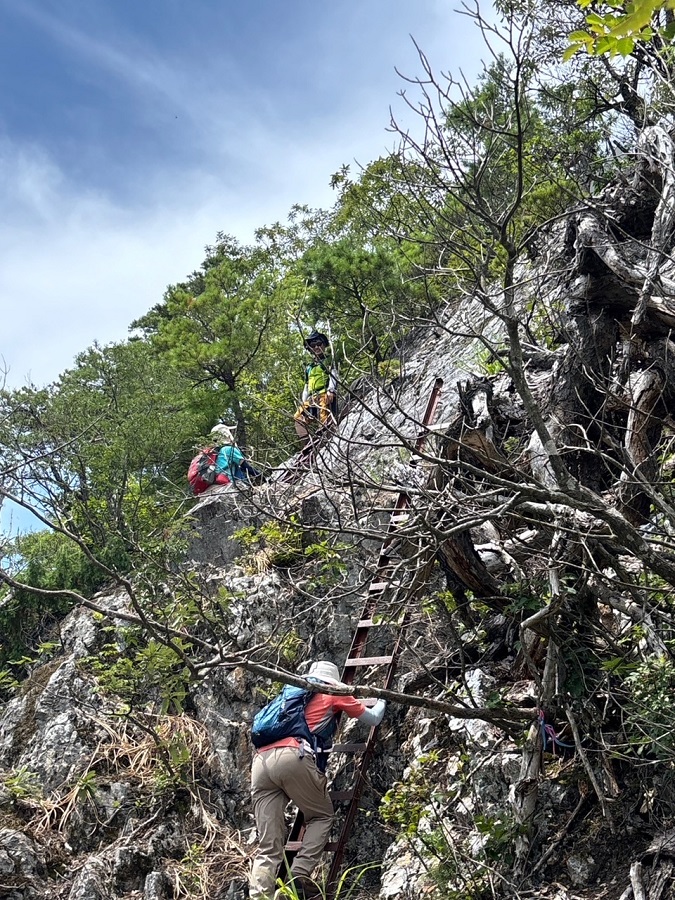 鉄製の梯子が2段になって掛けられている絶壁。慎重に登ります。