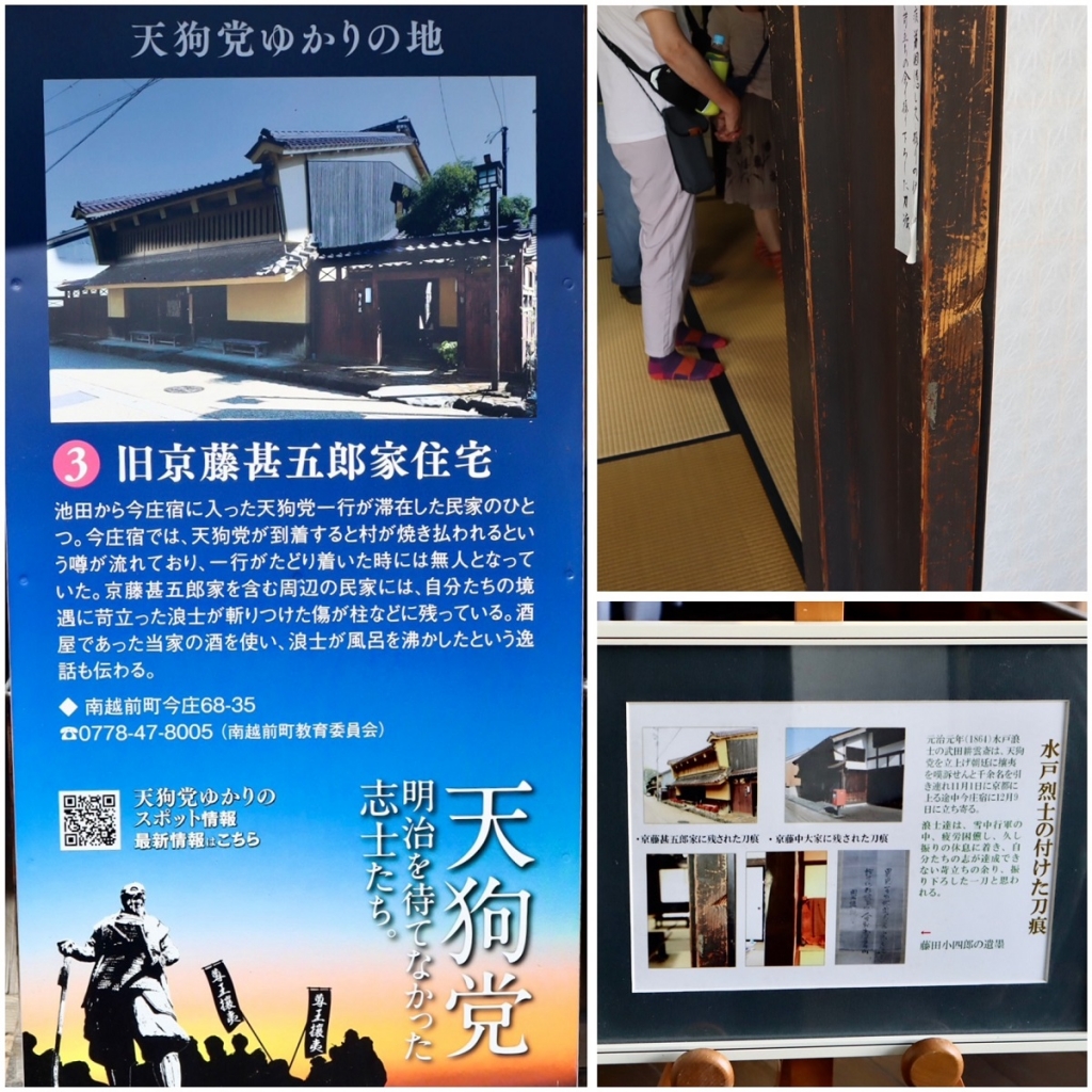 京藤甚五郎家:県指定有形文化財。江戸時代に建築された福井県内最古級の町家。中を見学させて頂き、係員の方からこの町家に関わる歴史や当時の武士が柱に付けた刀の痕跡などの説明を伺うことができました。