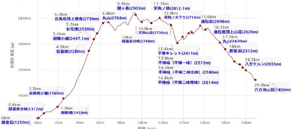 天狗山荘05:05発→天狗の頭05:25-05:35→天狗の大下り06:00→不帰の嶮取付07:00→不帰Ⅰ峰07:25→不帰Ⅱ峰08:30→唐松岳09:30-09:45→唐松岳頂上山荘[昼食]09:50-10:35→丸山ケルン11:10→八方山12:25→八方池山荘12:50着/13:15―(リフト・ゴンドラ)→八方駅13:55→八方第5駐車場14:10着