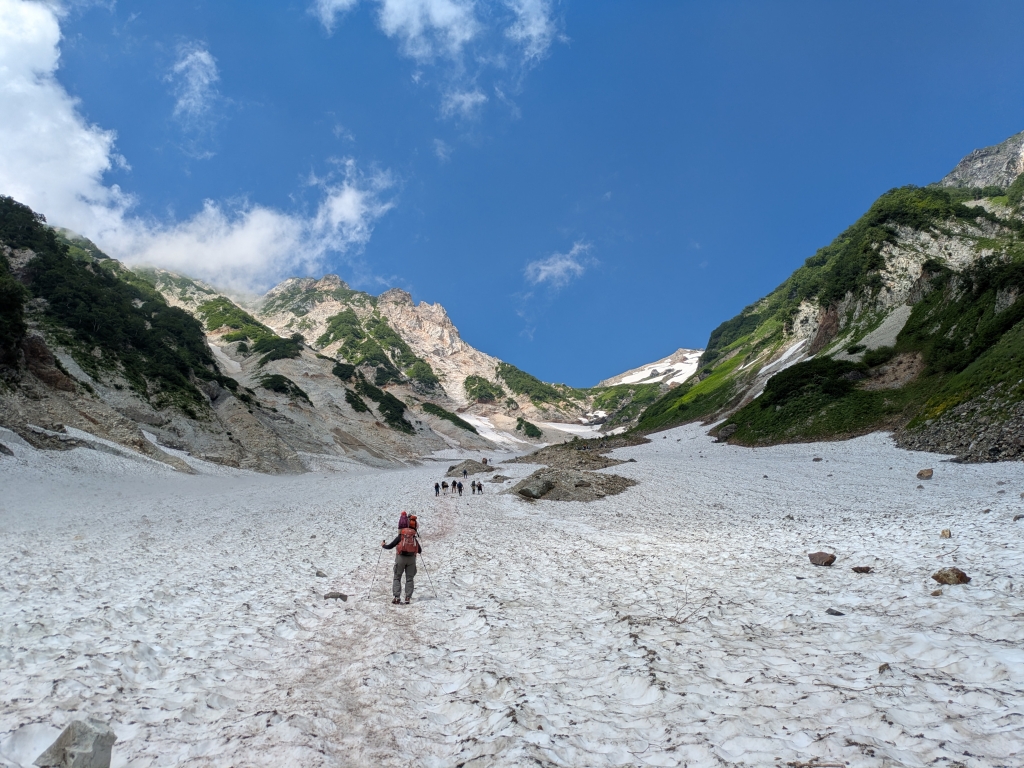 今年は雪が多かったこともあり、大雪渓の雪は多いように感じる。全員が12本アイゼンにヘルメットを装着するが、周りを見渡すと軽アイゼンの人が多いように思えた。