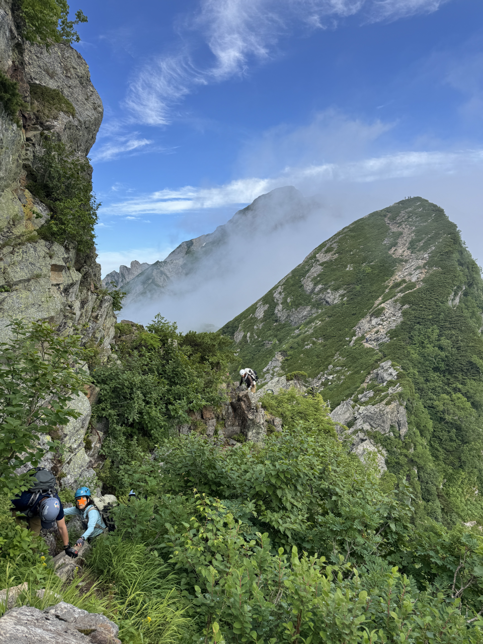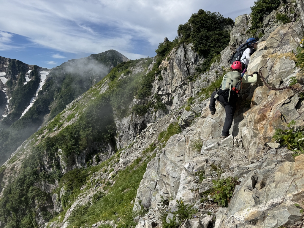 その前にある天狗の大下りも難所で一気に300mを下る。ガレ場に続いて鎖のある長めの岩場が現れる。下りでもあり気が抜けない。落石を起こさないことにも注意し、全員がトラブルなく通過。