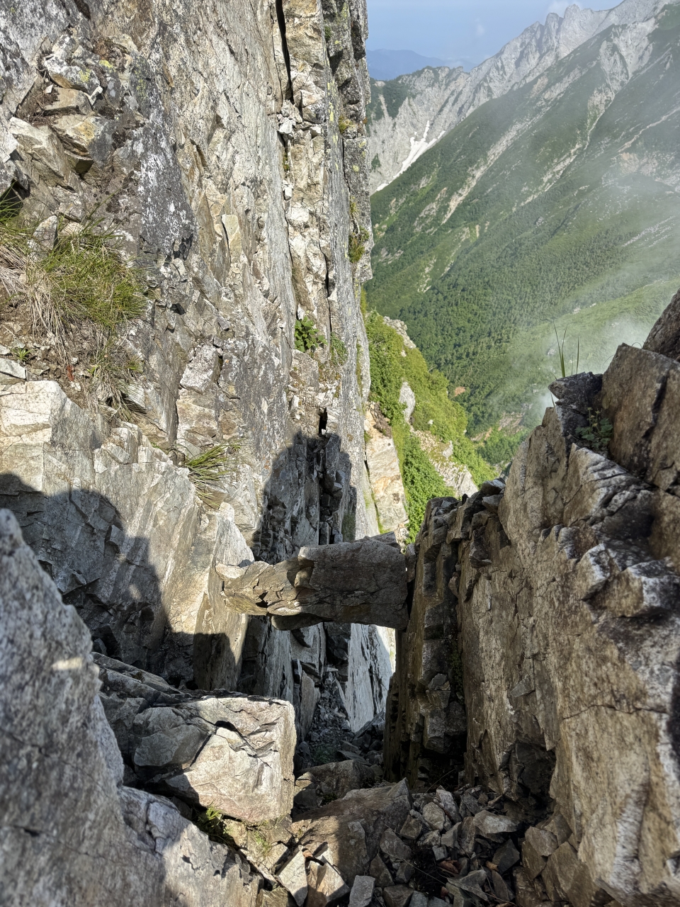 しばらく歩くと難所の「天狗の大下り」に入る。取付き部からは不帰の嶮がⅠ峰、Ⅱ峰北峰、Ⅱ峰南峰、Ⅲ峰の4峰で構成されていることがよく判る。唐松岳山頂には多くの人も見える。