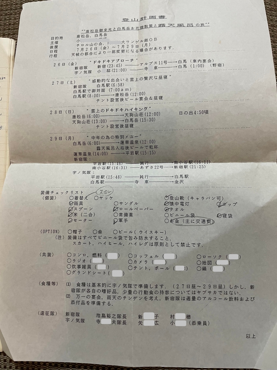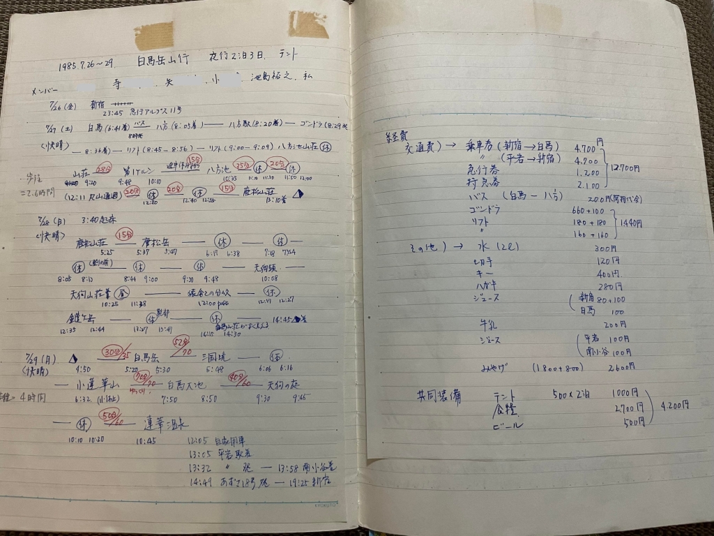 しかもテントを担ぎ、計画書には「米二合、ビール・ウイスキー持参」などとあり、当時の登山の様子を思い起こすことが出来ました。