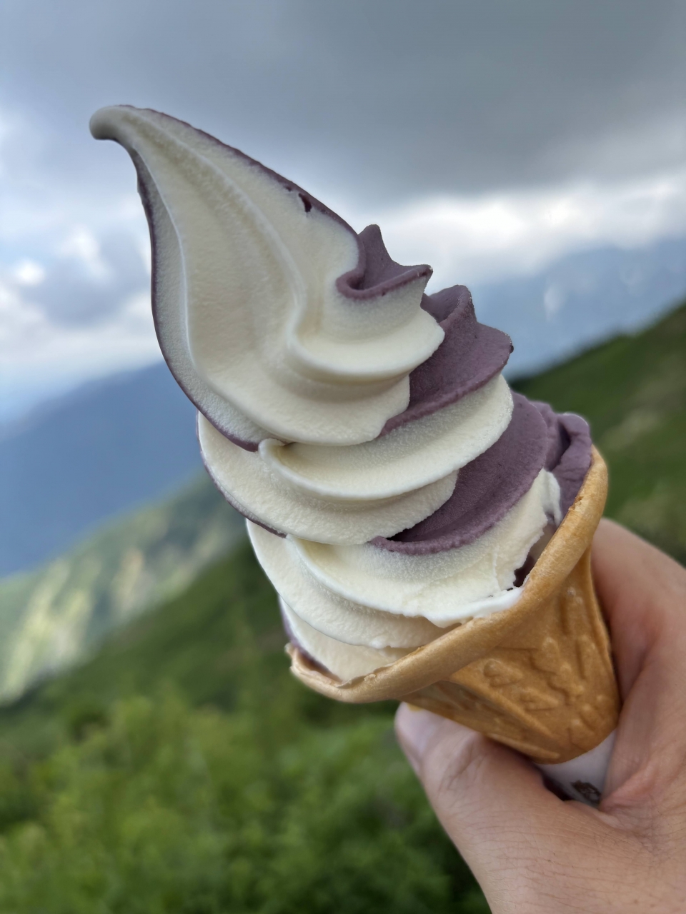 八方池山荘前ではお決まりのアイスクリーム。今回はブルーベリーとのミックスで疲れを癒す。