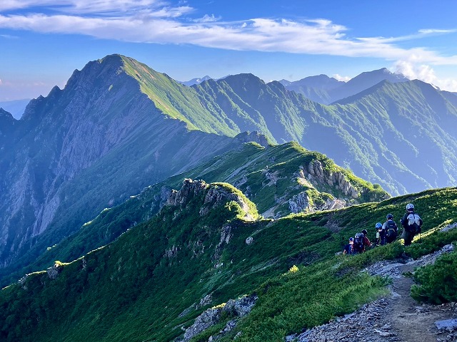 アップ、ダウンを繰り返し絶景をみながら種池小屋へと続く稜線を行く例会参加者。眺望は言うまでもなく素晴らしいの一言。