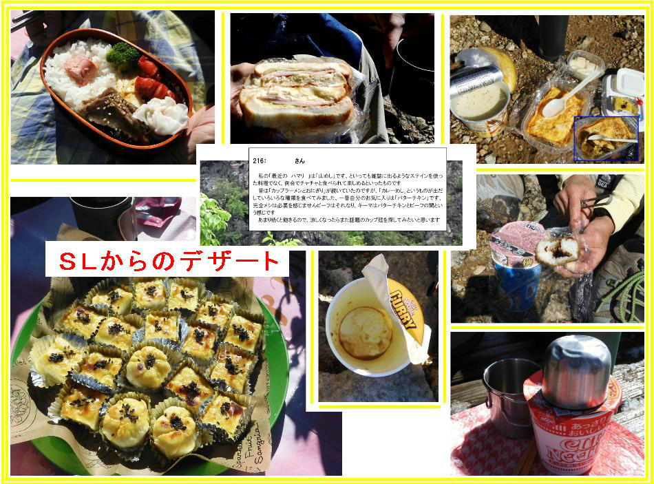 山頂アタック隊で出かけたので帰ってきた時にはすでに終了した方もあり、ご協力いただいたみなさんの「山めし」を撮影しました