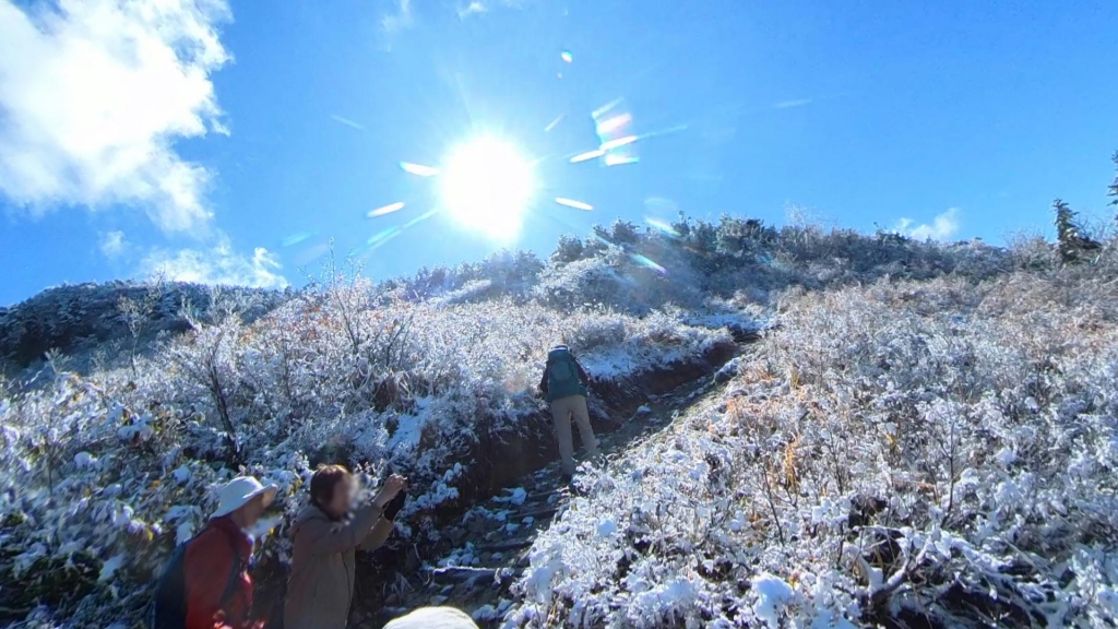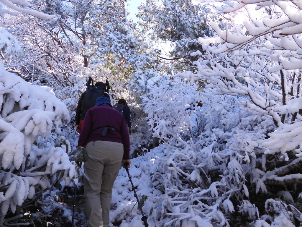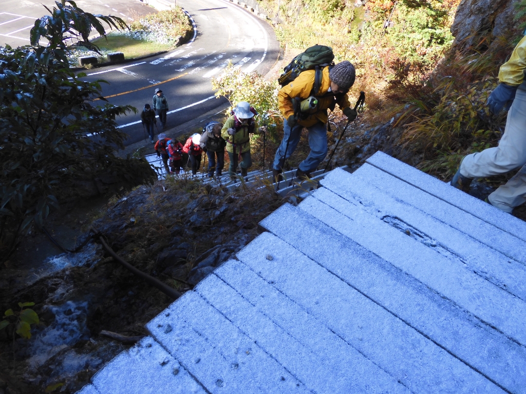 このあたり、こういった木製の工作物の上は白くなっていて霜なのか雪なのかと話していたのですがどうやら雪のようで、歩いていると木の葉っぱに積もっていた雪がとけ、雨のようにポタポタと落ちてきます