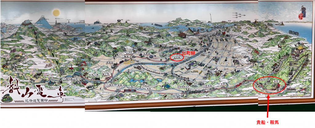 ひんやりとした朝の空気の中、出町柳から貴船口までは開業100周年を迎えた叡山電車で移動。記念事業で作成された絵図は分かりやすい。