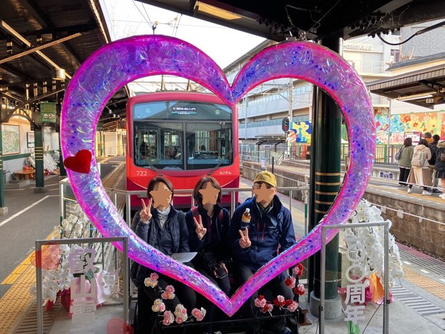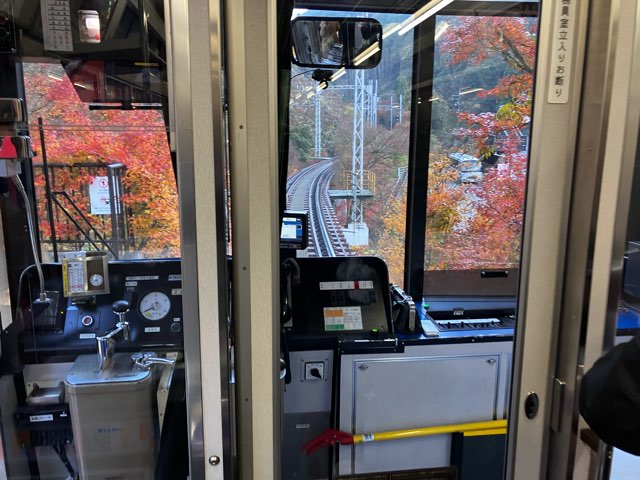 仲良し3人組で記念ショット。貴船手前の市原駅~二ノ瀬駅の約250m区間は「もみじのトンネル」で知られ、近づくにつれ運転席越しに写真を撮ろうとする乗客でごった返していた。