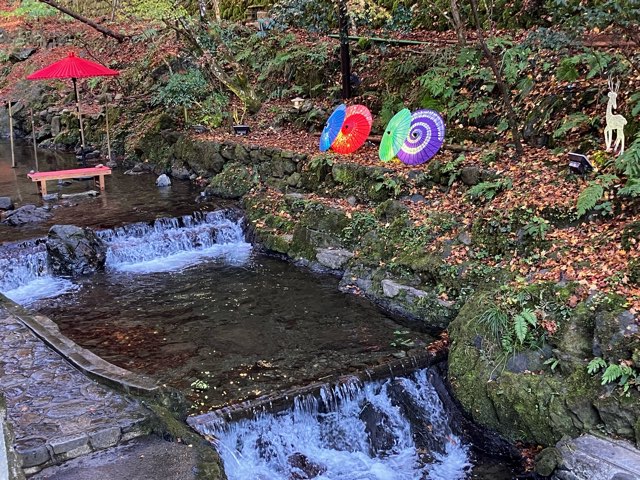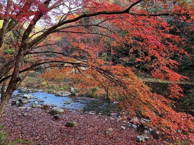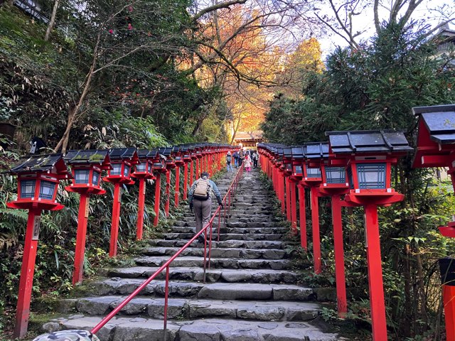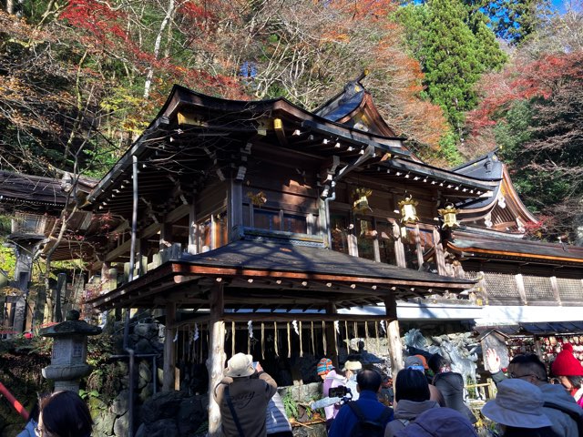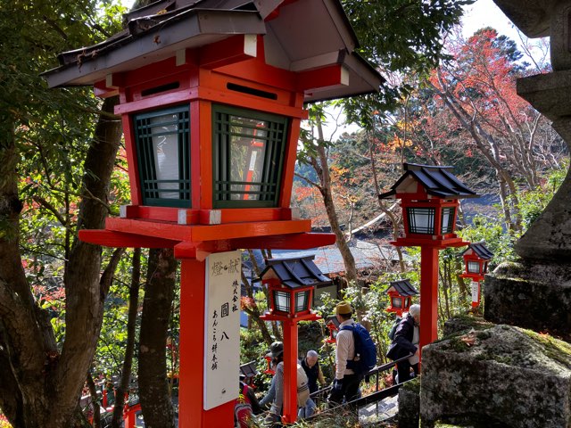 貴船口駅で降りて、貴船川沿いに歩き神社へ向かう。紅葉はピークを過ぎていたが、まだ残る川沿いのもみじと地面を覆う赤い落葉もまた風情がある。