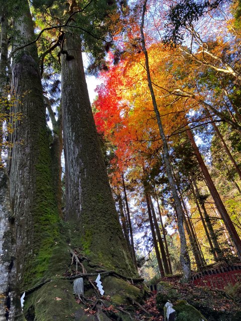 右は相生の杉のご神木。同じ根から生えた2本の杉で樹齢1000年。相生=あいおい=相老、夫婦ともに長生きの意味。