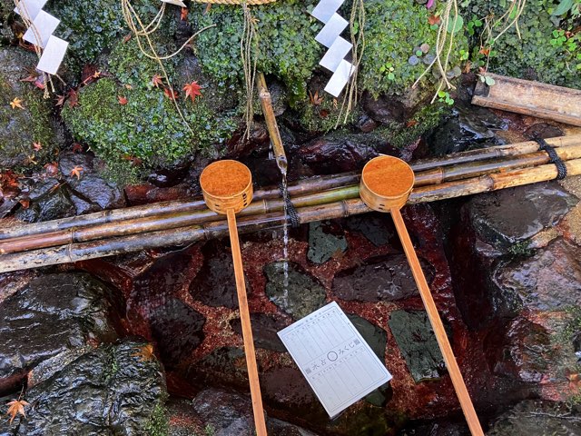 水の神様にちなみ、水占いがある。おみくじの紙をご神水に浸すと文字が浮かび上がる。QRコードも付いており多言語対応の優れもの。ご神託に一同ひきこもごも。