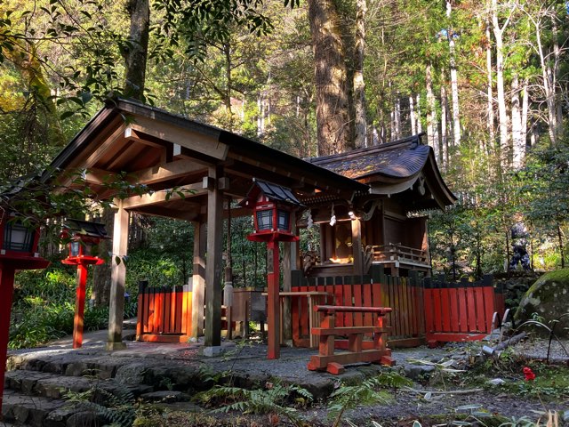 本宮からさらに川沿いを先へ進むと奥宮に至る。本殿下には巨大な龍穴(りゅうけつ)があるという。日本三大龍穴と言われるパワースポット。