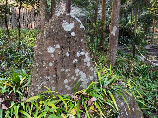 平安時代の女流歌人・和泉式部の歌碑。夫との仲がうまくいかず、神社を参拝し、切ない心情を歌に託して祈願したところ、社殿の中から慰めの返歌が聞こえたという。下は川沿いにあった蛍岩。