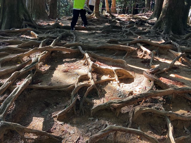 歩きにくいと思ったらここは、「木の根道」。固い地盤のため杉の根が地表を這うように伸びている不思議な景観。