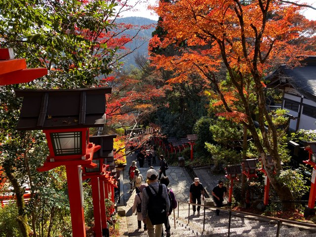 自然豊かな山の中に、由緒ある貴船神社や天狗伝説の鞍馬寺があり、すっきりとした秋晴れのもと、まだ残る鮮やかな紅葉を楽しみながら、