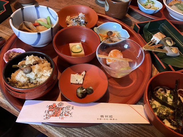 山歩き修行でお腹がペコペコに。昼食に山門近くの「雍州路(ようしゅうじ)」というお店で精進料理をいただいた。品数も多く、やさしい味付けで美味しかった。お茶は不思議な京の味。