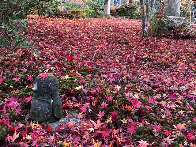 紅葉が美しい庭園を見て縁側でほっこりするメンバー。お地蔵さまもほっこり笑顔。