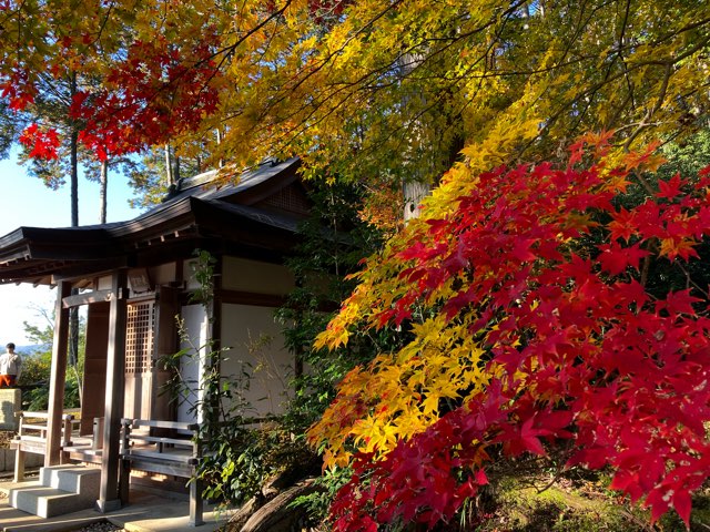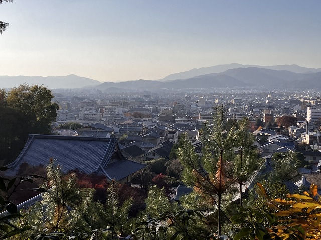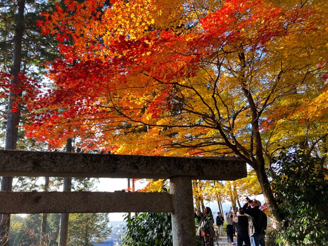高台から市街を一望。黄色と赤色の葉が混じる不思議なモミジも綺麗だった。
