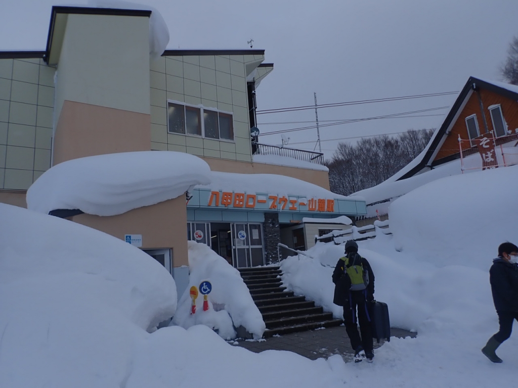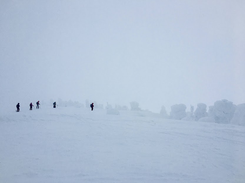 ほぼ全員がスノーシューやスキーをレンタルして、ロープウェイで山頂駅へ。