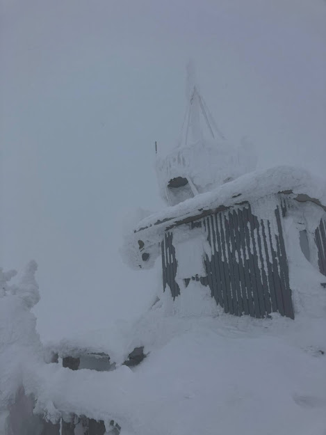 山頂駅でスノーシューをはいて外に出ると、霧のため視界不良。雪交じりの風も強い中、トレースを頼りに電波塔周辺を散策。