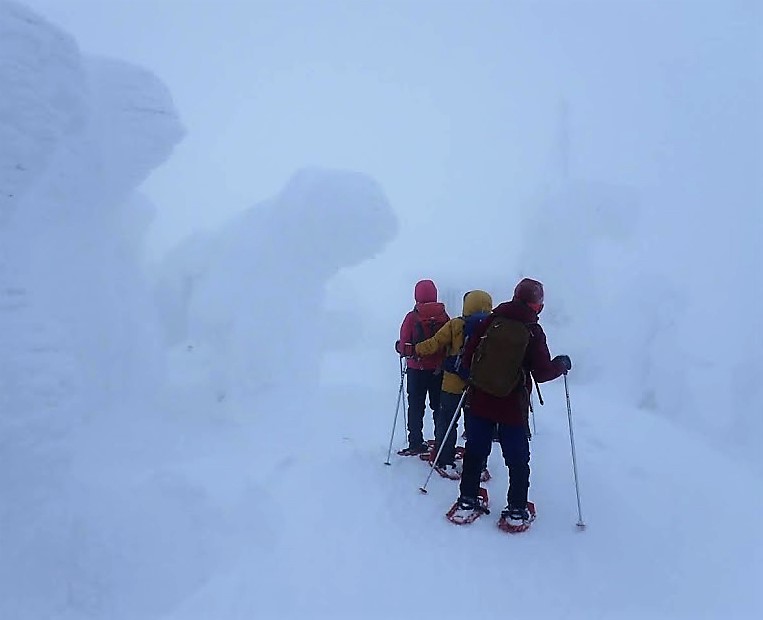 8:00ホテル出発(ジャンボタクシー)→9:00八甲田国際スキー場(山麓駅)→スノーシュー等レンタル→10:30八甲田ロープウェイ山頂駅→10:40~14:00スノーモンスター周辺散策・昼食→14:10~15:00山麓駅、スノーシュー等返却→(ジャンボタクシー)15:20酸ヶ湯温泉着