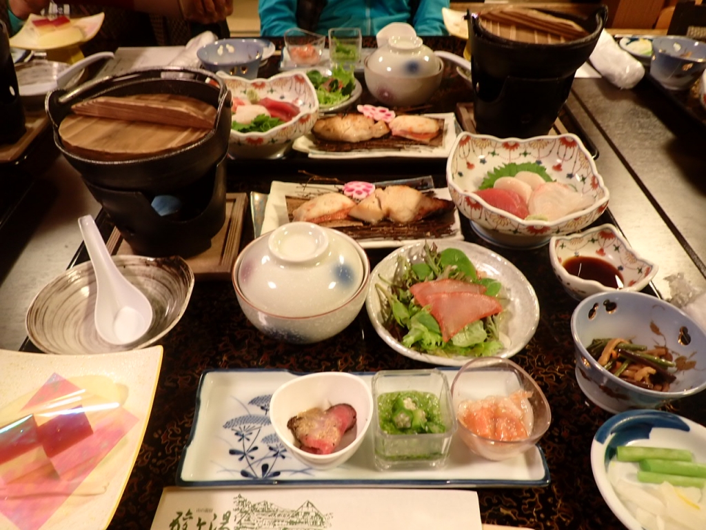 お楽しみのお食事タイムは品数も多くおいしくて、お酒好きの皆さんは飲み比べて楽しんでいました。朝食は品数いっぱいのバイキング。みそ汁は昔懐かしい、煮干し出汁。