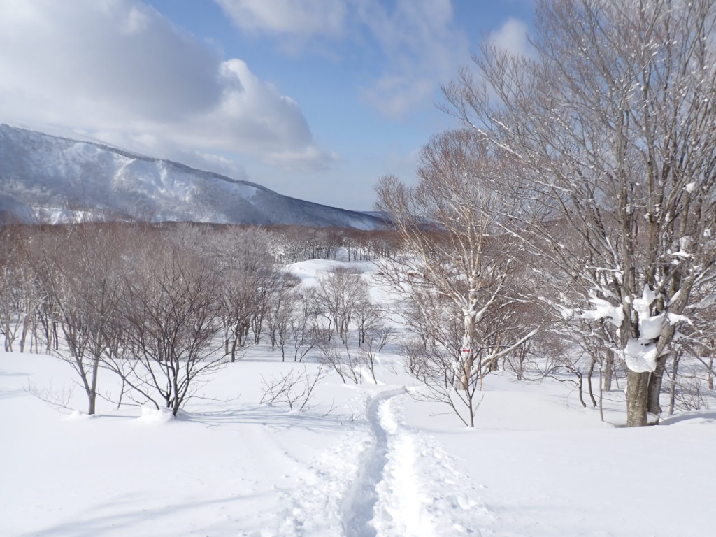 少し風が弱くなり、明るくなってきたので電波塔より先に行ってみました。一瞬ですが、視界が開けて田茂萢岳が見えました。