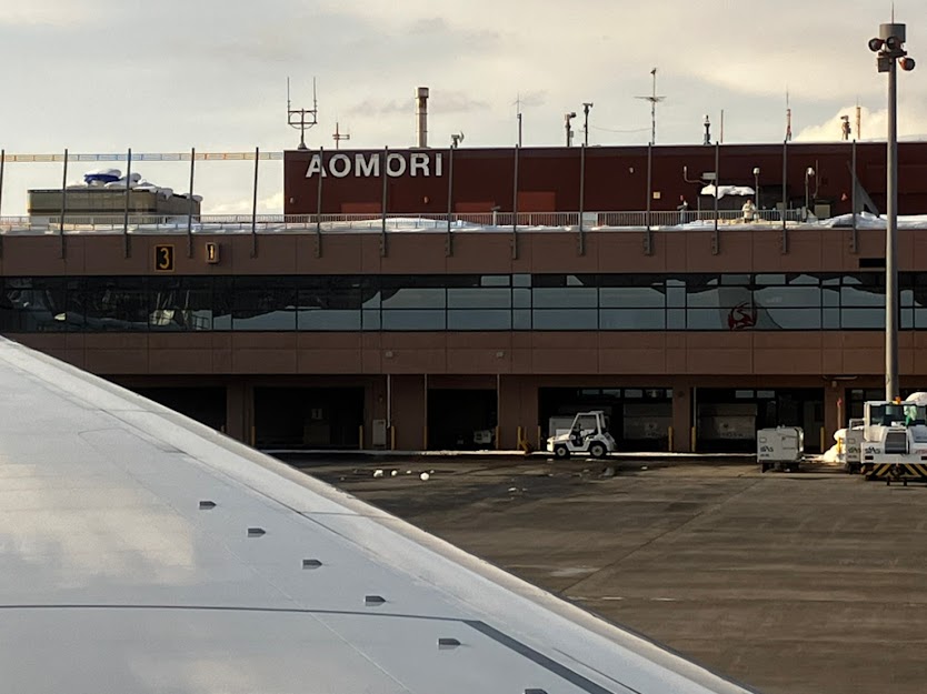 青森空港。建物に、JALのロゴが写っています。さらば青森、また会う日まで!!