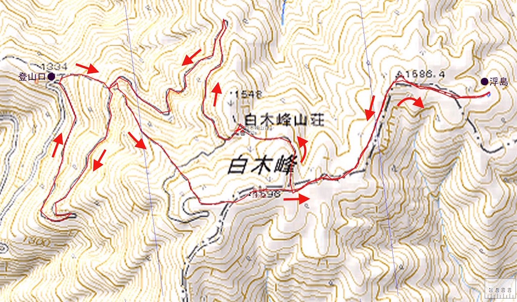 コースタイム集合場所 - 6:00 - 白木峰登山口 8:10 - 白木峰頂部 8:53 - 白木峰山頂 9:09 - 浮島 9:50 - 白木峰山荘 10:27~(昼食)11:00 - 白木峰登山口 12:00 - 集合場所 14:08