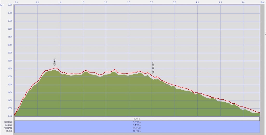 概要 標高グラフを見ればわかると思いますが、登山口から白木峰頂部まではかなりの急登が続き、頂部に出てしまえば広大な平原が広がっている感じで、ほぼ水平道の木道歩きになります。