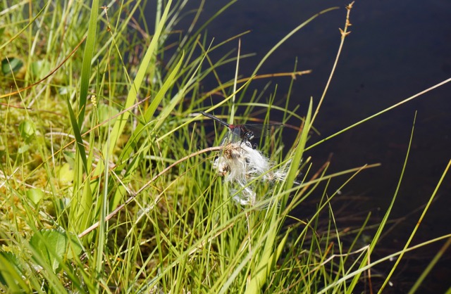 ワタスゲの名残に止まっているのは「カオジロトンボ」高原の湿地帯に生息しているトンボです。
