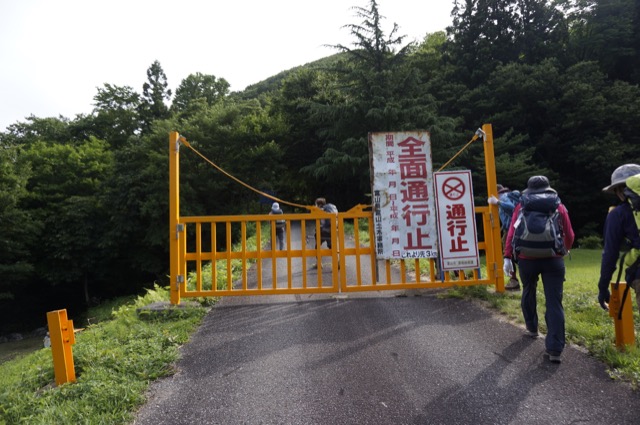 林道には「全面通行止め」のゲートがあり車両は入り込めないように封鎖されていました。
