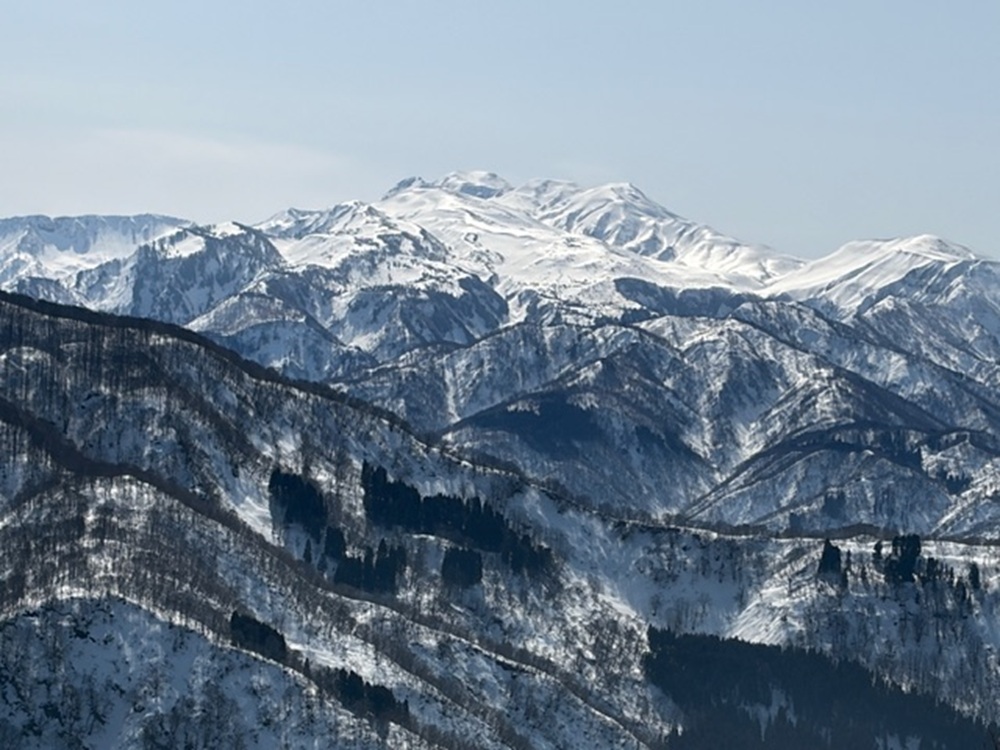 登山途中に見えた、真っ白く冠雪した金草岳に光りがあたりが美しかった